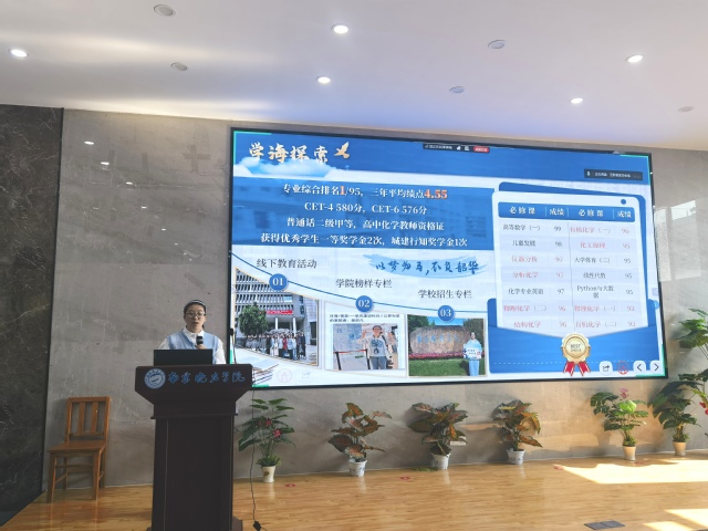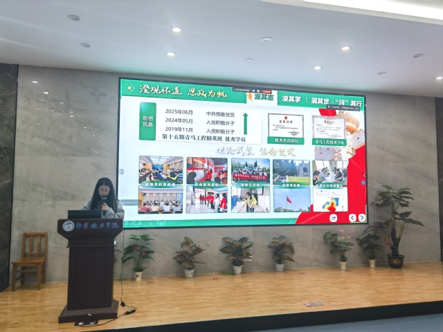展示环节中,5位候选人倾情分享了各自的奋斗故事与心路历程。从理论学习的深入钻研到实验室里的不懈探索,从投身“挑战杯”等高水平赛事的淬炼到参与社会服务的无私奉献,他们用扎实的成绩单、丰硕的竞赛成果与真挚的实践感悟,生动诠释了何为“教学做合一”。他们不仅展现了出色的专业能力与创新思维,更传递出严谨的治学态度与主动担当的成长意识,为现场同学树立了鲜活的学习标杆。在谈及未来规划时,各位候选人对升学深造与职业发展路径的清晰展望,也为学弟学妹们提供了极具参考价值的成长范本。
