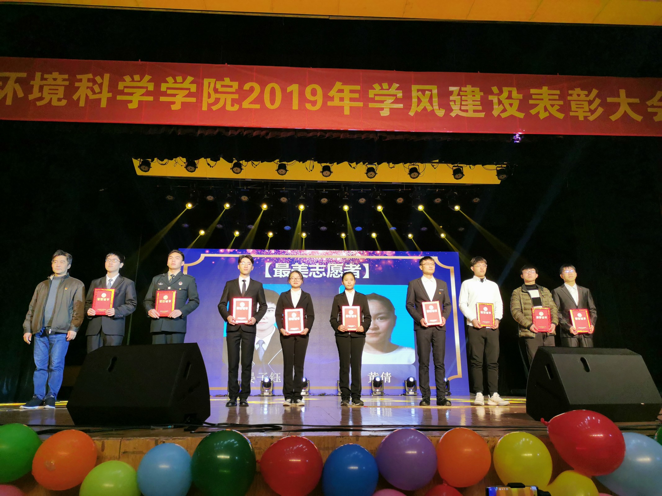 大会表彰了2018-2019学年校行知先进班集体、2019年度学风建设优秀班团会、学风优良班级、学习型宿舍、最美环科人、和在省级以上学科竞赛中获奖的团队和个人。与会领导和嘉宾为获得表彰的先进集体和个人颁发了荣誉证书并合影留念。
