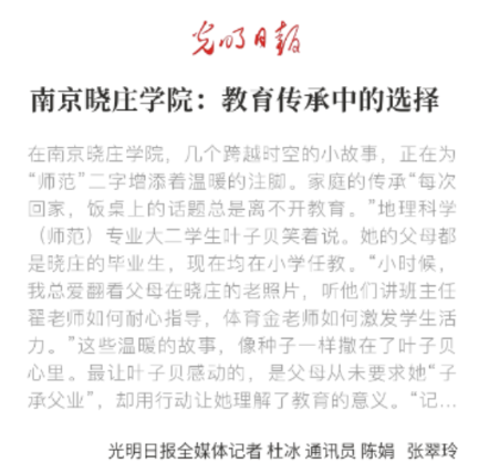 12月21日,《光明日报》客户端发布通讯《南京晓庄学院:教育传承中的选择》,聚焦环境科学学院师范生代际相传、师生接力的动人故事,展现了我院在传承师范教育本色基础上的创新与发展。