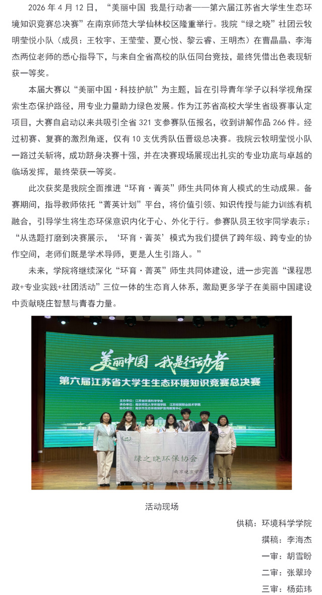 环科学子在第六届江苏省大学生生态环境知识竞赛中荣获一等奖