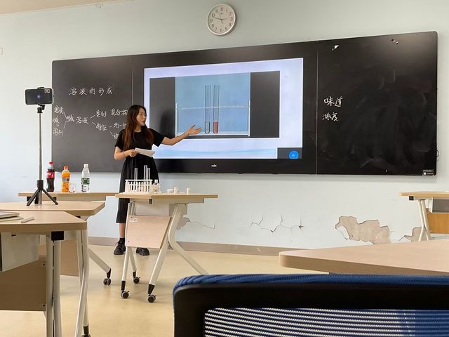 在教室里,四位大三和大二化学师范生针对不同版本的九年级化学教科书,围绕两个主题开展同课异构,周密的板书设计、巧妙的生活取材、有针对性的化学实验演示,俨然小老师模样,现场十几位富有教学热情的同学在旁聆听;活动通过腾讯会议实时直播,南通大学、西华师范大学、黄冈师范学院、汉江师范学院等师范院校二十多位本科生和研究生一同聆听探讨,两位汉江师范学院的化学师范生在千里之外表达了自己对晓庄学子课堂教学的看法。南京市优秀青年教师、南师附中仙林学校年级组长、2013届毕业生任宁生老师作为十年前化学师范生备课组活动负责人,线上全程参与,为学妹们指点迷津;常州明德实验中学化学教研组长、2006届毕业生谢小瑜老师听课后高度赞扬学妹的课堂表现,并结合一个课堂实例提出建议。国家奖学金和江苏省优秀毕业生荣誉称号获得者陈科羽同学在现场协助负责人王松、邢文媛两位同学开展备课组成员的课后讨论,并结合自己获得教学比赛国家一等奖和考编第一名的经验提供了很多宝贵意见。