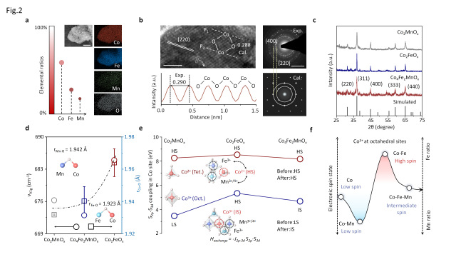 利用晶场理论和磁性离子的位占据偏好,以半选择性的方式将磁性位引入到传统的尖晶石结构催化剂Co₃O₄, 从而实现晶格内的交替原子杂交。与传统Co3O4相比,自旋电子态调制Co4Fe2MnOx的过电位显著降低240 mV,同时在200 mA cm-2的高电流密度下保持300 h以上的工作稳定性。这为酸性OER用高性能非贵金属氧化物催化剂的设计提供了新的思路。该工作发表在国际高水平刊物Journal of Colloid and Interface Science上。