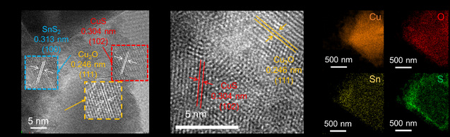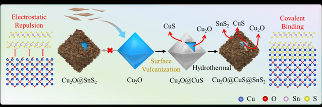 通过在Cu2O表面原位生长CuS与SnS2,成功制备了Cu2O@CuS@SnS2核壳异质结构催化剂,旨在高效、高选择性地光热催化CO2转化为乙烷(C2H6)。得益于引入的CuS层,其光热效应可使温度升至58°C,足以触发SnS2的2H到1T相变。同时,在紧密接触的SnS2、CuS和Cu2O之间构建了有效的电子通道,使得Cu2O框架内大量光生电子得以持续供给光热催化体系。更重要的是,CuS与SnS2之间的内建电场引发能带弯曲,形成S型异质结。这种独特结构不仅实现了光生电荷的有效分离和迁移,还延长了载流子的寿命,从而显著提高了光热催化效率。结果表明,Cu2O@CuS@SnS2催化剂表现出较好的性能,C2H6产率高达110.9 μmol g-1 h-1,选择性达到67.0%。这种由光热效应诱导的从非活性相到催化活性相的转变为高效光催化剂的设计提供了新的见解。该项工作发表在国际高水平刊物Chemical Engineering Journal上。