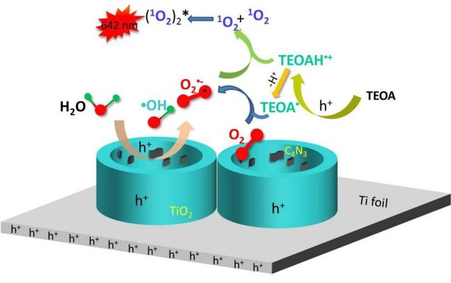 将C4N3纳米片原位结合到TiO2 NTs/Ti电极上,赋予TiO2 NTs更多的氧空位和更快的电荷转移能力。在C4N3/TiO2/Ti电极上,由于C4N3/TiO2异质结构具有适当的催化和富氧能力,在中性pH下通过水氧化和溶解氧还原产生大量的1O2。TiO2 NTs的管状形状使1O2的二聚体产生强烈的ECL发射,并成功地应用于多巴胺检测,检测限低至7.6 pM。水氧化偶联1O2的生成将极大地促进新的ECL反应体系的发展,并扩大ECL技术的生物传感应用,该工作发表在国际刊物Surfaces and Interfaces上。