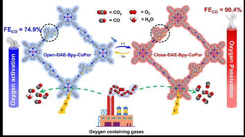 我们将具有光刺激结构变化的单元1,2-双(5'-甲酰基-2'-甲基噻吩-3'-基)环戊烯(DAE)集成到钴卟啉基共价有机框架中,首次提出了氧钝化策略来提高有氧条件下电催化CO2还原性能。利用闭环的DAE可以钝化氧气的特点(当DAE处于开环状态时,促使能量从钴卟啉活性位点转移到氧气,能够实现对氧气的活化,而当DAE处于闭环状态时,钴卟啉活性位点与氧气之间不生能量转移,实现氧钝化),抑制氧还原的发生,实现了模拟烟道气条件下(5% O2)高效将CO2转化为CO(选择性为90.5%),分别比无DAE存在的催化剂以及DAE处于开环态的催化剂提高了近3.5倍和1.2倍。同时闭环结构增强了框架材料的导电能力,实现了-20.1 mA cm-2的CO部分电流密度。这项工作为工况条件下的CO2催化转化提供了新方法(Nat. Commun. 2024, 15, 1479)。该工作是高被引以及热点文章。
