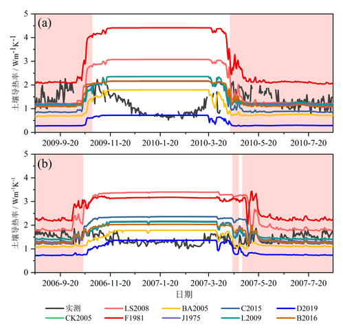 Figure 4: Variations in the observed soil thermal conductivity (STC) (black line) and STC simulated by CLM5.0 with nine STC schemes at 5 cm soil depth at the QT03 (a) and QT04 (b) sites. The shaded and white areas represent the thawed and the frozen periods, respectively.