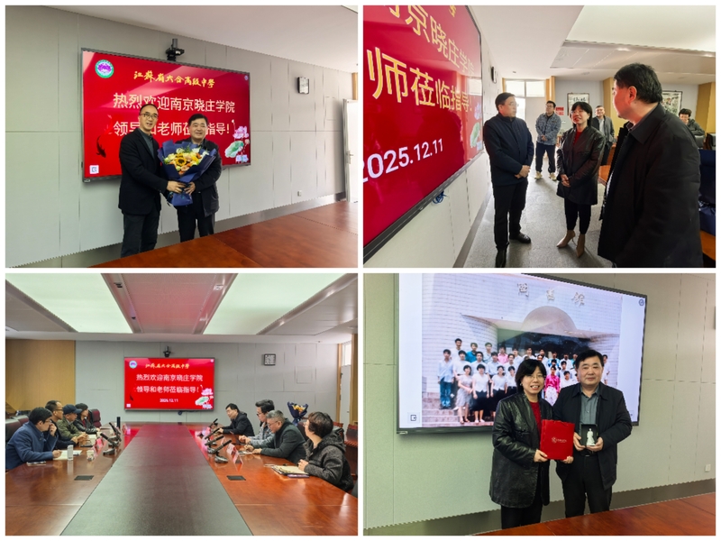 为传承晓庄精神、凝聚校友力量,12月11日上午,环境科学学院“百年晓庄”校友寻访专班协同学校校友会办公室,专程赴江苏省六合高级中学走访杰出校友、2025江苏教师年度人物厉业余。六合高级中学党委书记徐爱民热情接待了寻访组一行,学校德育处主任孙优、化学组教师孟翔、周媛共同参加座谈交流。厉业余校友系我校1993届化学专业毕业生,从教三十二年来,始终扎根基础教育一线,潜心育人。他现为中学正高级教师、江苏省教学名师、南京市高中化学学科带头人,曾获江苏省模范教师、青海省委省政府脱贫攻坚先进个人、南京市斯霞奖、“感动江苏教育人物——最美中学教师”提名奖等多项荣誉,主持完成多项省市课题,在《化学教学》等核心期刊发表论文20余篇,多篇被人大复印资料全文转载,在教育实践与科研领域均取得了突出成就。座谈会上,环境科学学院院长段海宝代表学院向厉业余校友敬献鲜花,表达母校对其深耕教坛、取得卓越成就的衷心祝贺与崇高敬意。厉老师现场展示了珍藏的大学时期照片,深情回忆了在母校求学的青春岁月,特别感念当年化工基础专业授课教师、我院退休教授薛蒙伟等恩师的悉心培养与人生指引。薛蒙伟教授作为当年执教老师应邀出席座谈会,亲眼见
